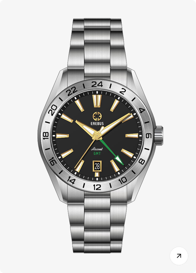 Elevating the collection through subtle but impactful enhancements, the Ascent 40 GMT is powered by the Miyota 9075 traveler GMT movement - offering true GMT functionality.