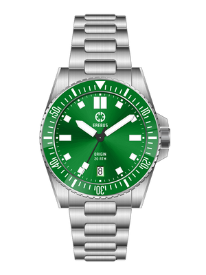 The outstanding curved H-link bracelet feature quick release springbars so you can swap between all available strap options entirely tool free. Remodelled specifically for the 38, the new bracelet features a smaller adjustable clasp giving approximately 10mm of sizing flexibility, and a chamfer to its bottom edge to enhance comfort and wearability. High quality military-style straps, silicone straps, and FKM rubber straps are available to compliment your Origin 38. They all feature Erebus branding on their fully brushed 316l stainless steel hardware.