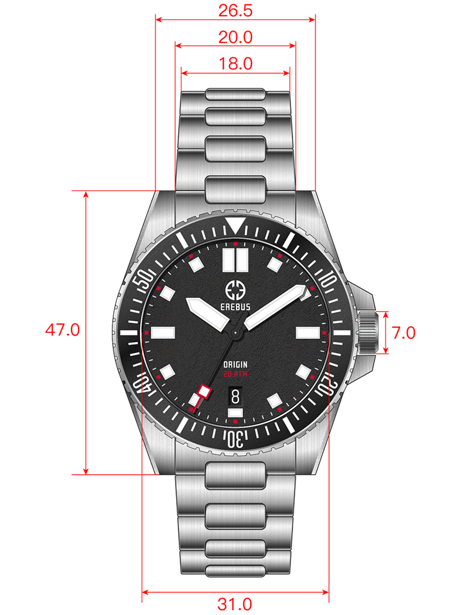 The precision made 120-click bezel can time your dive or your boiling egg. 20 ATM of water resistance means the Origin 41 is ready for anything. The fully graded fully brushed bezel insert is also fully lumed, of course. The guarded 6.5mm crown is a pleasure to use and provides ample grip even with wet or gloved hands.