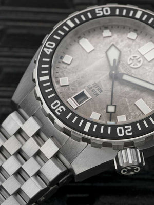Dial choices are off the charts. Choose between rare volcanic obsidian or meteorite mineral dials, fumé sunburst or granular dials, all choices complemented by all brushed, fully lumed ceramic bezel inserts.