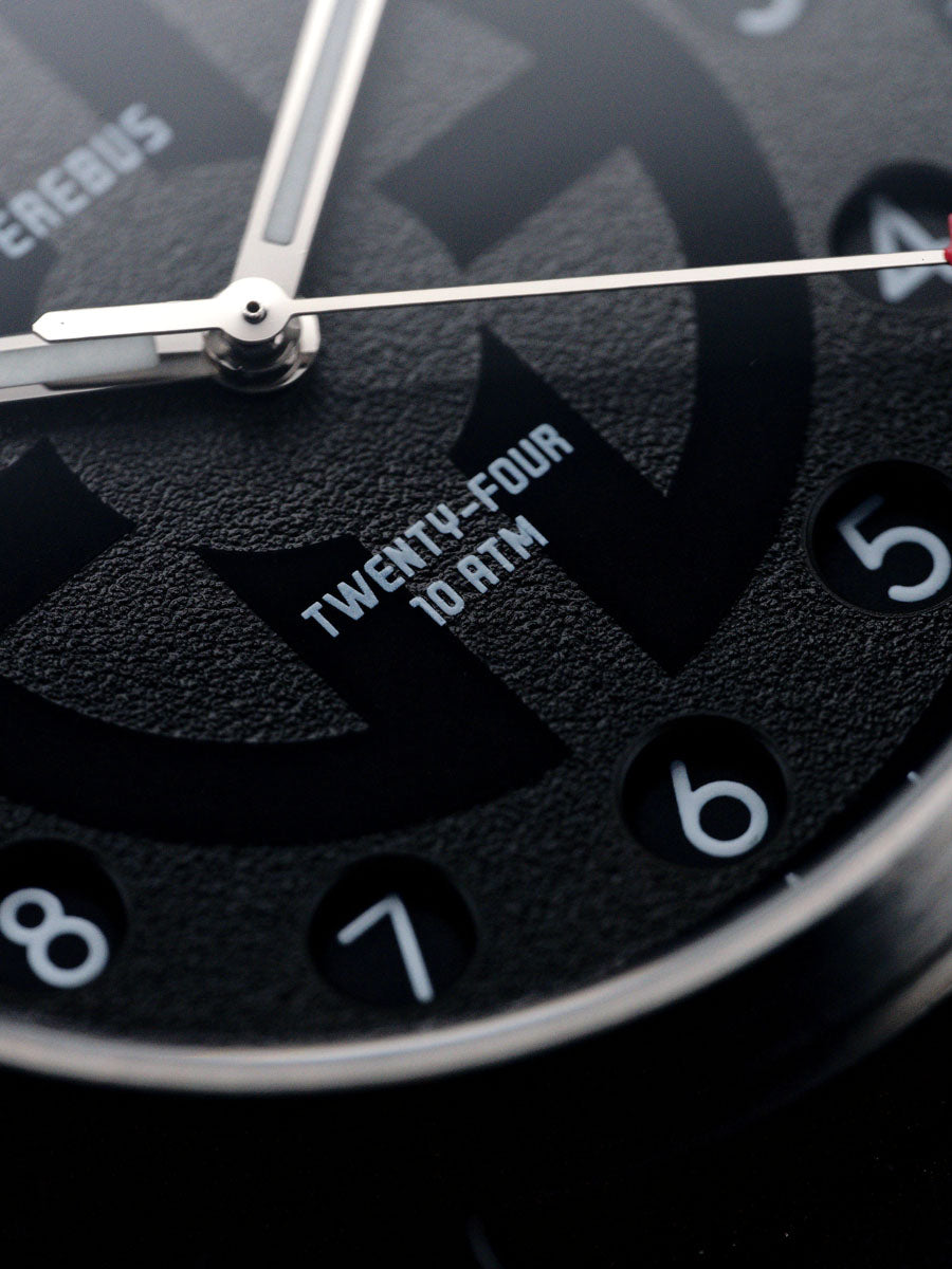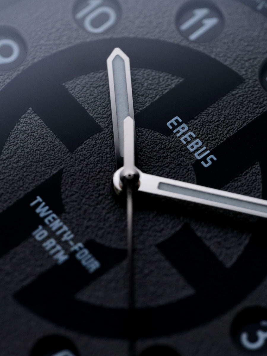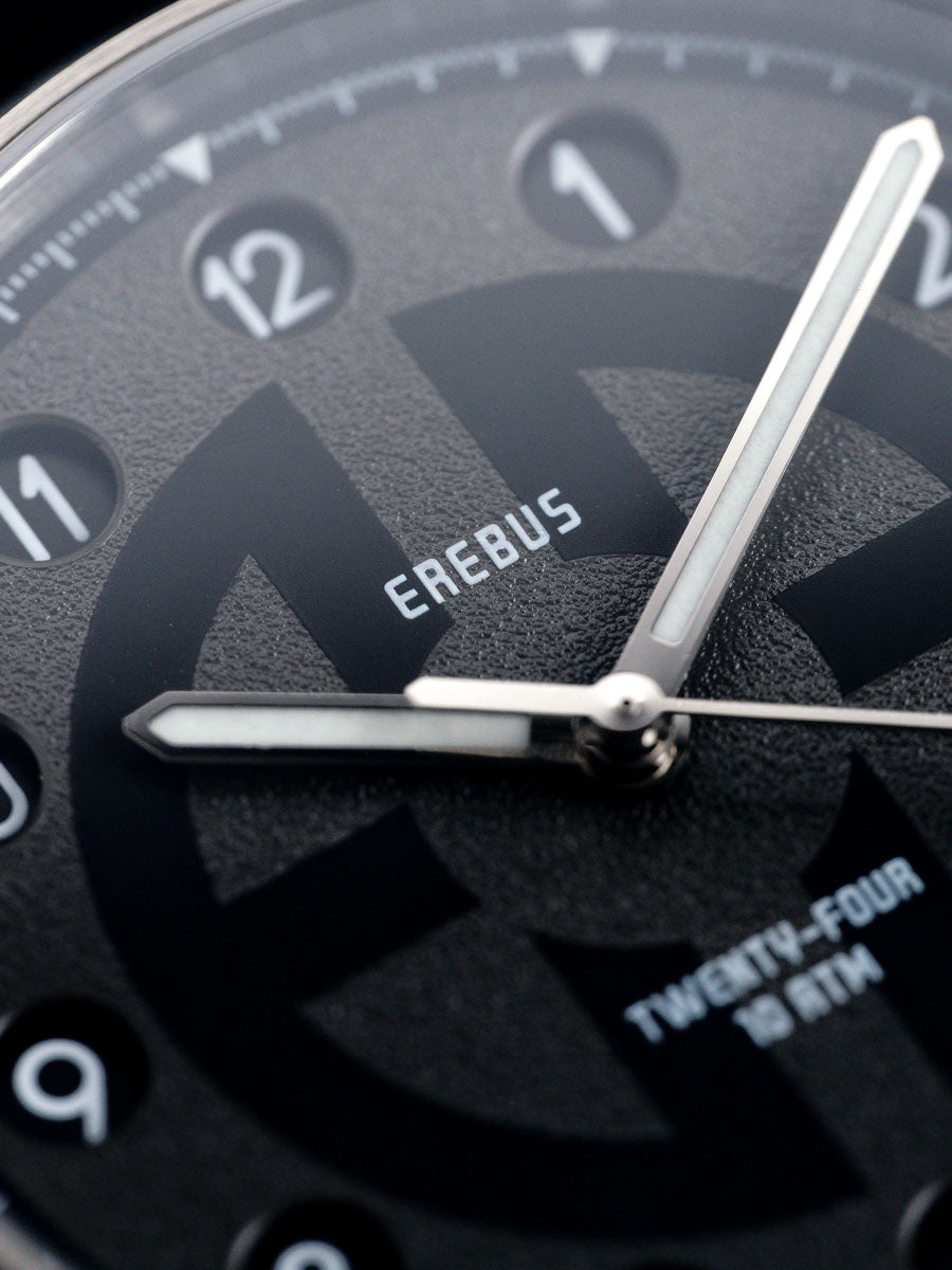As with every Erebus release, the specifications are uncompromising. A flat sapphire crystal with multi-layer anti-reflective coating ensures exceptional clarity, while BGW9 Super-LumiNova on the hands and markers guarantees legibility after dark.